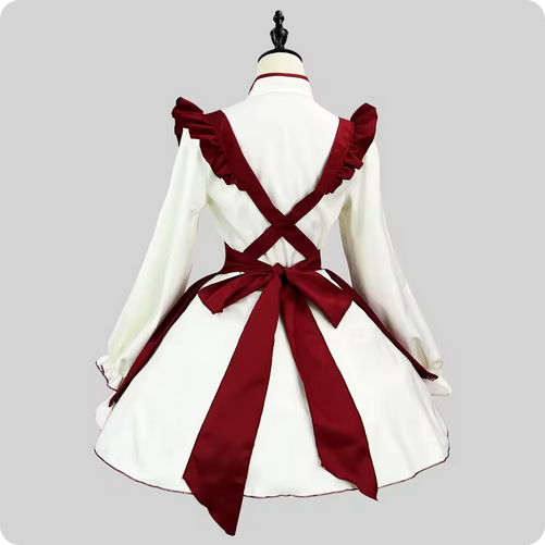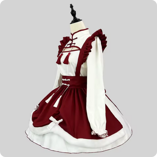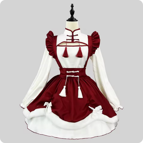 チャイナ風ロリータ メイドワンピース コスプレ衣装 赤×白 フリル リボン付き